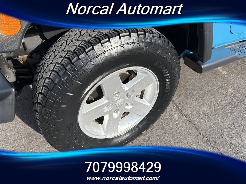 - Exterior: Classic Wrangler styling with removable top and doors for open-air driving flexibility, full-size spare tire mounted on the rear tailgate, and factory-finished Blue paint.
