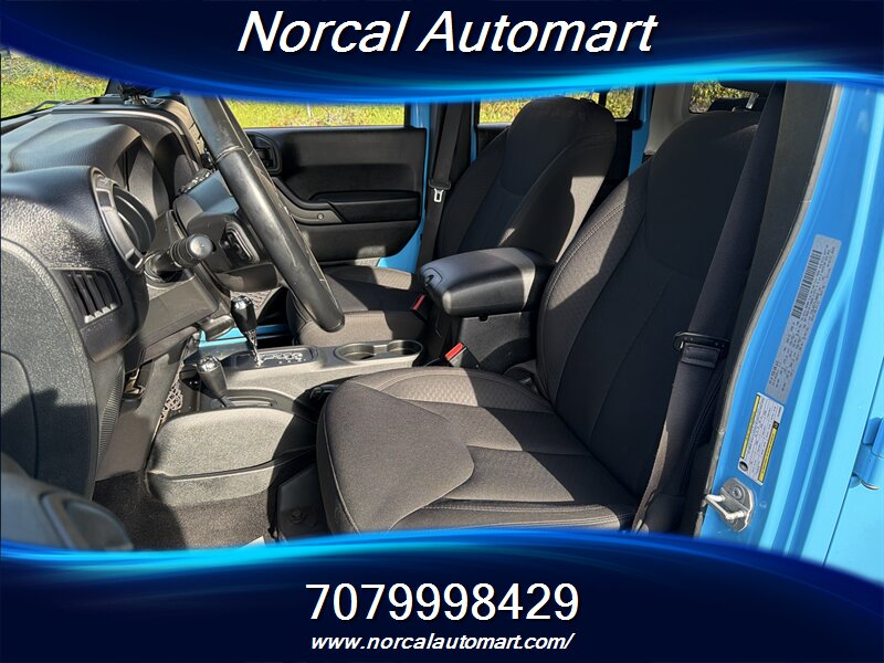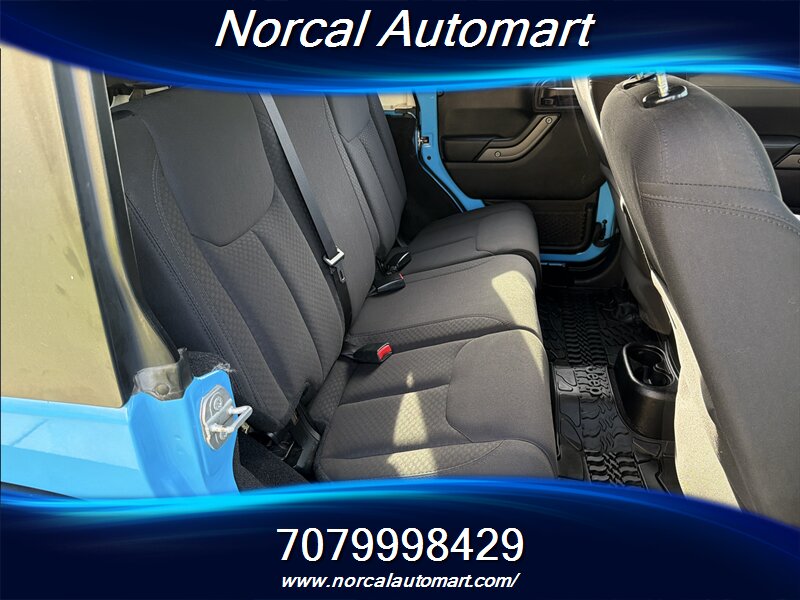 - Interior and comfort: Black cloth seating surfaces, durable upholstery and trim designed for easy cleaning, fold-flat rear seats to expand cargo capacity, and ample rear-seat legroom typical of the Unlimited four-door configuration.
