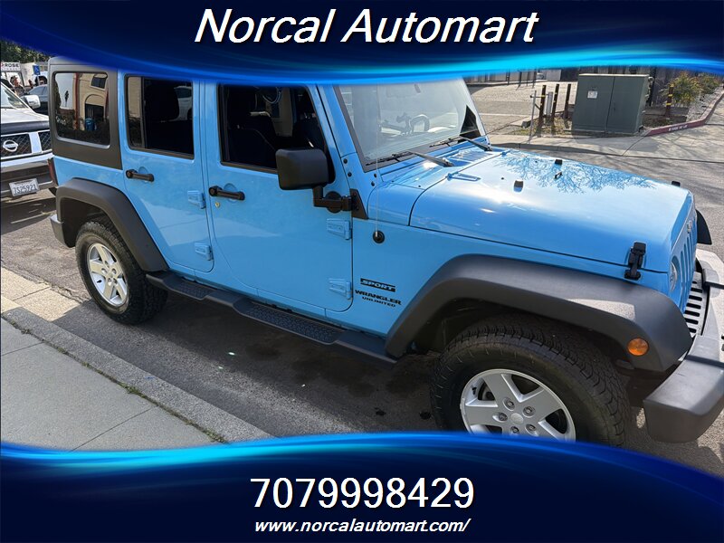 2017 Jeep Wrangler Unlimited Sport — Blue exterior with Black cloth interior. Powered by the 3.6L Pentastar V6 producing 285 hp and 260 lb-ft of torque, this four-door Unlimited combines everyday usability with genuine off-road capability. EPA fuel economy is approximately 16 MPG city and 21 MPG highway. The vehicle is in excellent overall condition, comes with a clean CARFAX report, and shows only one previous owner.